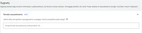 W kampanii Performance Max pojawiła się możliwość dodania maksymalnie 10. tematów wyszukiwania – słów lub wyrażeń, których mogą używać klienci, poszukujący danych produktów bądź usług.