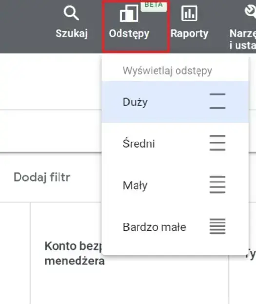 Na niektórych kontach w panelu Google Ads pojawiła się możliwość dostosowania odstępów między wierszami. Aby to zrobić, należy wybrać zakładkę „Odstępy” w górnym menu.