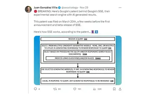 Juan Gonzalez Villa, hiszpański konsultant i ekspert SEO, odkrył wspomniany dokument i podzielił się nim ze społecznością na Twitterze. W wątku pod swoim tweetem zauważa, że wniosek ten został złożony 20 marca, kilka tygodni przed oficjalnym ogłoszeniem SGE przez firmę. Obecnie jest to jedyny znany patent Google, który jednocześnie odnosi się do generatywnych modeli sztucznej inteligencji i procesu wyszukiwania, a jego treść doskonale współgra z funkcjonalnością eksperymentalnej wyszukiwarki. W abstrakcie patentu czytamy, że przedstawia on metodę: Selektywnego wykorzystania dużych modeli językowych do generowania podsumowań w języku naturalnym w odpowiedzi na zapytania.