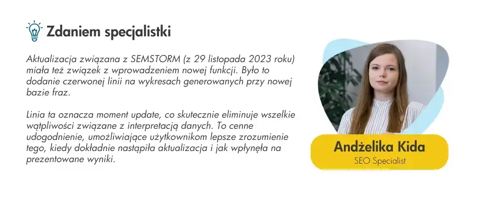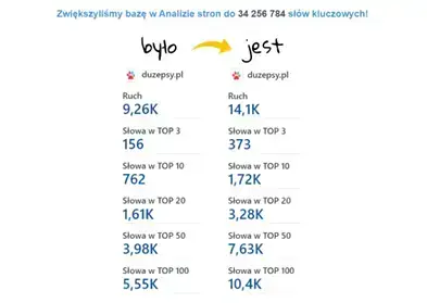 SEMSTORM, jedna z czołowych polskich platform SEO/SEM, wprowadziła nową bazę słów kluczowych. Dotychczasowe zasoby, liczące 26 milionów monitorowanych fraz zostały rozszerzone, a obecnie narzędzie śledzi aż 34 miliony słów kluczowych. Można swobodnie przełączać się między nową a starą bazą danych. Nowa baza jest jednak ustawiona jako domyślna, co oznacza, że użytkownicy korzystający z SEMSTORM lub jego API prawdopodobnie zauważą nagły wzrost widoczności na swoich wykresach (w około 99%).Wzrost ten wynika wyłącznie z rozszerzenia bazy monitorowanych fraz i nie ma związku z rzeczywistymi efektami pozycjonowania. Strona była widoczna na nie już wcześniej, lecz narzędzie wcześniej zwyczajnie ich nie uwzględniało.