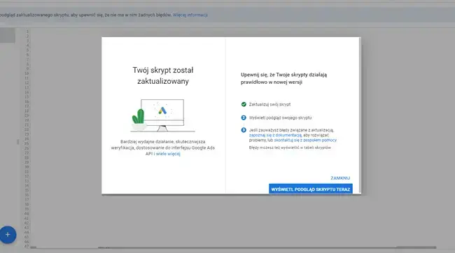 Skrypty Google Ads umożliwiają kontrolowanie danych za pomocą kodu JavaScript. Przykładowe zastosowania skryptów to automatyzacja procedur lub interakcje z danymi zewnętrznymi. W nowej wersji, Google postanowiło całkowicie przebudować background, tak aby umożliwić korzystanie z nowych funkcji interfejsu Google Ads API. Na ten moment wypuszczona została wersja beta. Aby rozpocząć pracę w nowej infrastrukturze, należy użyć przełącznika w górnej części edytora skryptów.