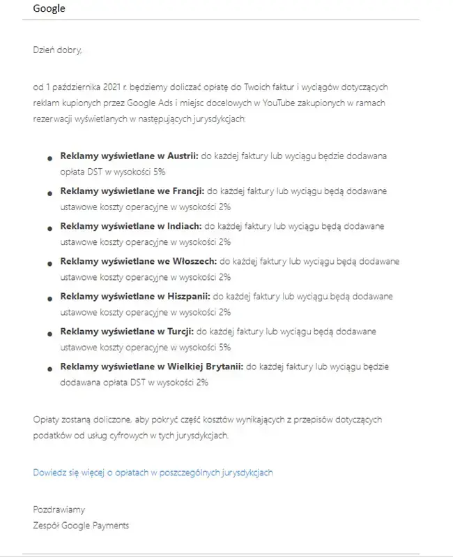 Od 1 października Google wprowadza dodatkowe opłaty doliczane do faktur. Opłata dotyczy reklam zakupionych w Google Ads oraz miejsc docelowych w serwisie YouTube zakupionych w ramach rezerwacji. Reklamodawca poniesie dodatkowe koszty w przypadku wyświetlania reklam w Austrii, Francji, Indiach, Włoszech, Hiszpanii, Turcji oraz Wielkiej Brytanii.