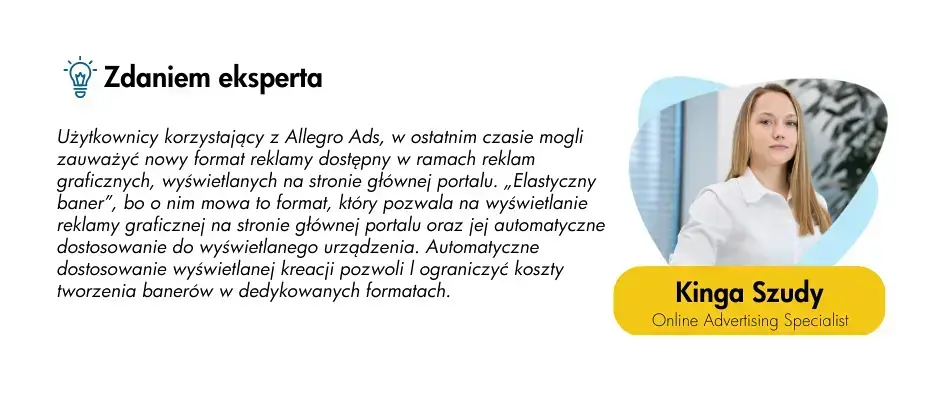 Od 15 lutego 2023 roku, można korzystać z nowego formatu reklamowego w systemie Allegro Ads. To zupełnie nowy typ reklamy graficznej (elastyczny baner na stronie głównej), który będzie automatycznie dostosowywał tekst i grafikę reklam do wyświetlania na różnych urządzeniach. Nowy format reklamowy jest dostępny w opcjach kampanii typu „Reklamy graficzne”. Aby z niego skorzystać, należy wybrać odpowiedni typ reklamy o nazwie „Elastyczny baner”.