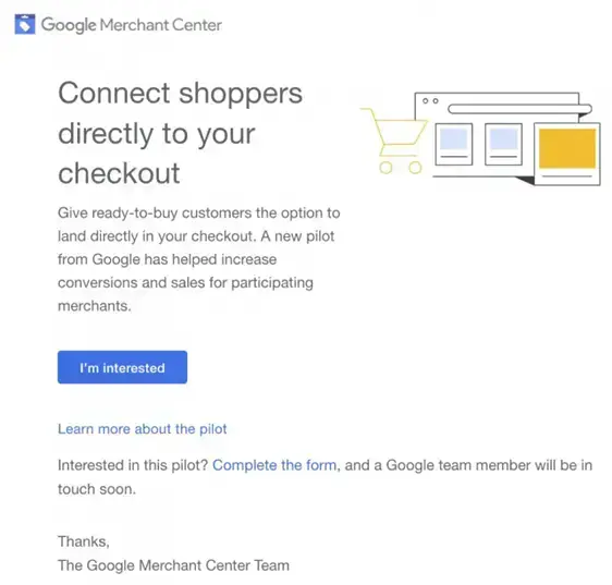 Google wysyła wiadomości e-mail do wybranych użytkowników Google Merchant Center, pytając, czy chcą wziąć udział w testach beta nowego przycisku wezwania do działania, który pozwala przekierowywać użytkowników z reklamy, bezpośrednio na stronę koszyka zakupowego.