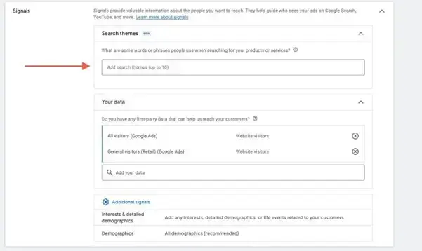 W kampanii Performance Max w ramach sygnałów implementowanych do kampanii pojawiła się nowa opcja, pozwalająca uwzględniać wyszukiwane motywy (słowa kluczowe) związane z danym produktem lub usługą (do 10).