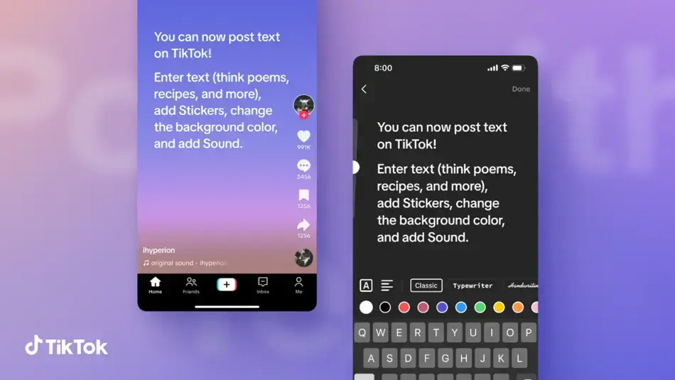 TikTok ogłosił wprowadzenie postów tekstowych dla wszystkich użytkowników. Posty te umożliwiają dodanie pełnoekranowego tekstu z muzyką, naklejkami i edycją koloru tła i czcionki. Długość postów tekstowych może wynosić do 1000. znaków.