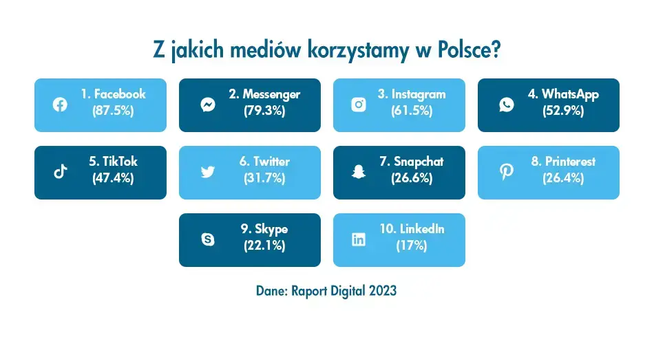 Z raportu Digital 2023 wynika, że wbrew pozorom – najpopularniejszą z wykorzystywanych przez internautów platform wciąż jest Facebook (choć średnio, wykorzystujemy mniej więcej 6 platform).