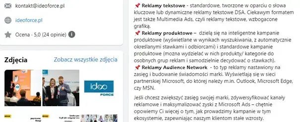 Poniższy przykład obrazuje sposób, w jaki prowadząc fanpage Ideo Force na Facebooku, w jednym z postów tłumaczymy odbiorcom znaczenie poszczególnych formatów reklamowych, z których można skorzystać w ekosystemie Microsoft Ads.