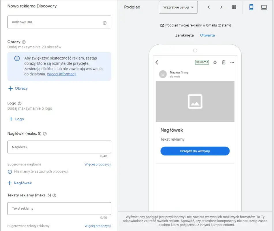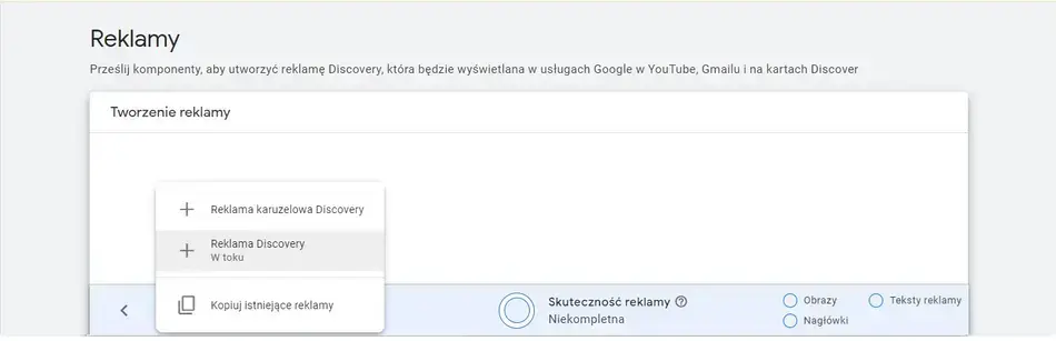 Zaczynamy od przygotowania niezbędnych komponentów reklam zgodnie z zasobami, potrzebnymi do stworzenia wybranego formatu reklamowego. Aby reklamy były skuteczne, warto skupić się na tym, by wykorzystywane w nich obrazy były dobrej jakości i przyciągały wzrok. Jeśli dana grafika, czy tekst sprawdzał się w prowadzonych wcześniej kampaniach, w innych kanałach – można przetestować jego działanie także w Google Discovery.