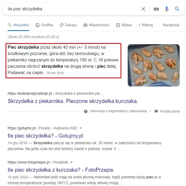 W wyszukiwarce możemy zobaczyć także wyniki direct answear. Często są określane, jako „pozycje zero”, ponieważ zazwyczaj wyświetlają się nad całą resztą wyników i odpowiadają bezpośrednio, bez potrzeby wchodzenia na daną stroną, na zadane przez nas w wyszukiwarce pytanie. Zazwyczaj pojawiają się, kiedy nasze zapytanie zaczyna się od słów: „jak”, „gdzie”, „ile” etc.