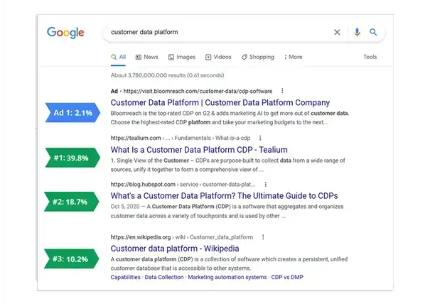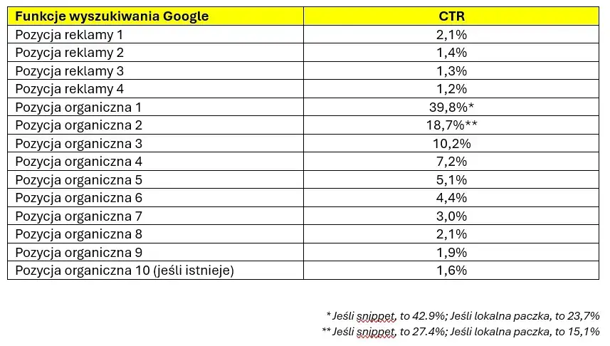 wyników na Search Engine Result Page wraz z odpowiadającymi im współczynnikami klikalności. Te Click Through Rate odnoszą się do stron wyszukiwania Google, które nie zawierają dodatkowych elementów, tj. mapy, obrazy czy filmy.