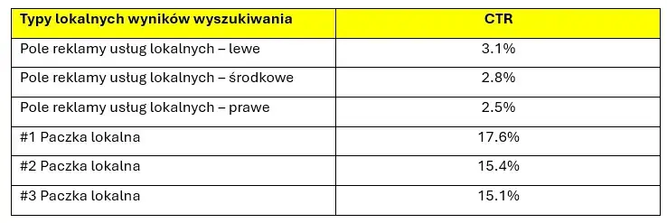 Poniższa tabela pokazuje współczynnik CTR dla każdego rodzaju lokalnego wyniku wyszukiwania, w tym dla Profilu Firmy w Google oraz dla Map Google. Obejmując zarówno wyniki płatne, jak i te organiczne.