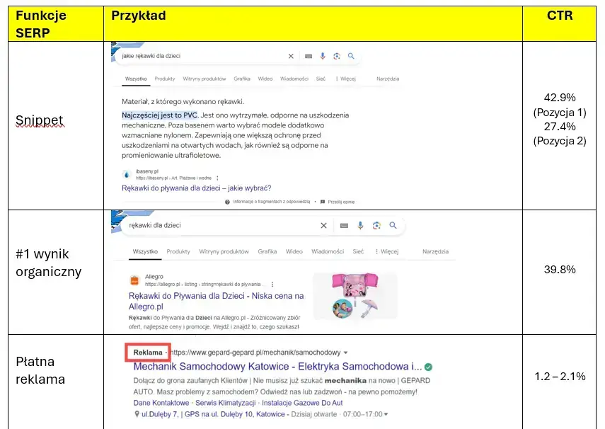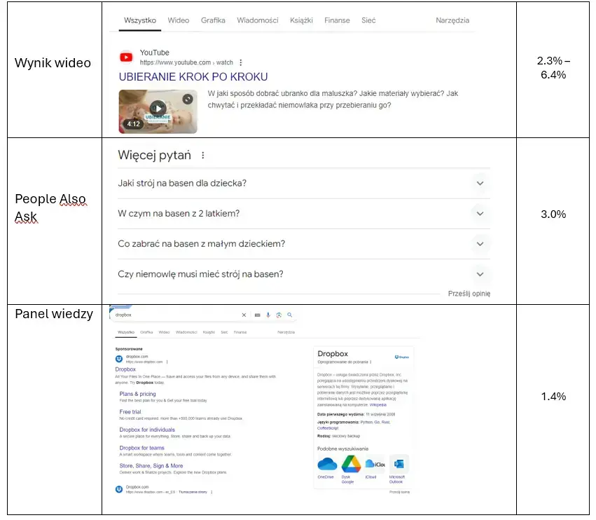 Poniższa tabela prezentuje średni współczynnik klikalności dla każdego elementu znajdującego się na stronie wyników wyszukiwania Google w 2024 roku. Te wyniki CTR odnoszą się wyłącznie do elementów z kategorii „Wszystkie” w wyszukiwarce Google i nie uwzględniają zakładek, tj. „Grafika”, „Produkty”, „Wideo”, „Wiadomości”, „Witryny produktów”, „Książki” itd.