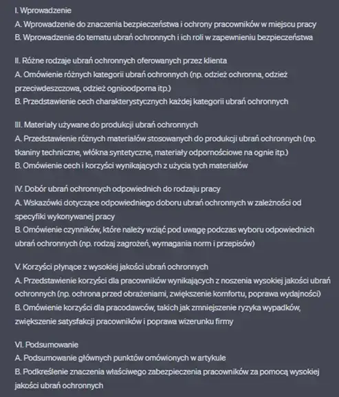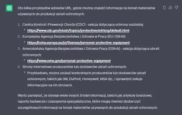 ChatGPT może znaleźć swoje zastosowanie również w odniesieniu do generowania listy źródeł bądź statystyk na dany temat. Musimy jednak mieć na uwadze, że wspomniany model od AI nie jest nieomylnym narzędziem, ponieważ posiada dostęp tylko do tych danych z końca 2021 roku. Stąd ważne jest, aby wykorzystywać narzędzia AI, takie, jak ChatGPT-4, jako wsparcie w procesie poszukiwania informacji. Tak, aby dalej dotrzeć do weryfikowalnych, aktualnych i wiarygodnych źródeł w celu uzyskania dokładnych i rzetelnych statystyk na dany temat. Przykład źródeł odnoszących się do „Materiałów używanych do produkcji ubrań ochronnych”: