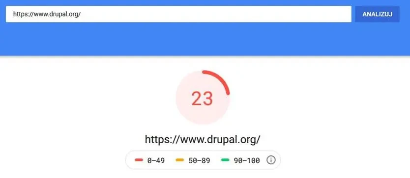 Warto zwrócić uwagę, że nawet serwisy najbardziej znanych systemów CMS mają nie lada problemy z uzyskaniem dużej ilości punktów w PageSpeed Insight – np. witryna https://www.drupal.org/ osiąga zaledwie 23 punkty.