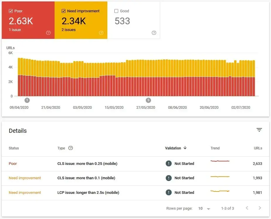 Koniecznie należy też zwrócić uwagę na to co pokazuje Google Search Console w raporcie Core web vitals. Podstrony wskazane jako Poor oraz Need improvment wymagają poprawy, a wskazane jako Good są optymalne.