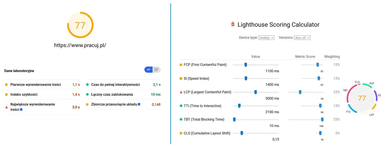 Na poniższym screenie pokazałem porównałem wyniku pokazywanego przez PageSpeed Insight a Lighthouse Scoring Calulator. Jak widać dla takich samych wartości 6 kluczowych faktorów wyniki punktowe są identyczne.