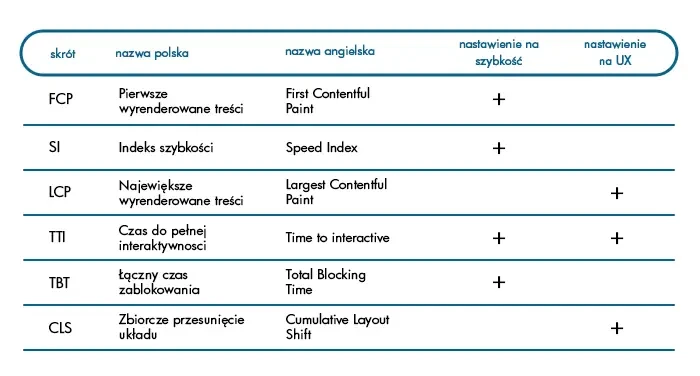 Time to Interactive (Czas do pełnej interaktywności) - TTI jest ważny, ponieważ niektóre witryny optymalizują widoczność treści kosztem interaktywności. Może to powodować frustrujące wrażenia użytkownika: strona wydaje się być gotowa, ale kiedy użytkownik próbuje z nią wejść, nic się nie dzieje. Jeśli uzyskujesz słaby wynik w tym faktorze to zoptymalizuj stronę pod kątem gotowości do interakcji np. poprzez: