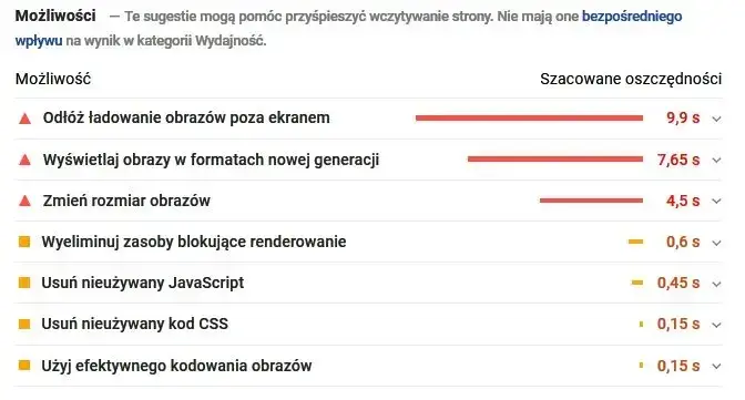 Fragment narzędzia PageSpeed Insight z możliwościami optymalizacji witryny