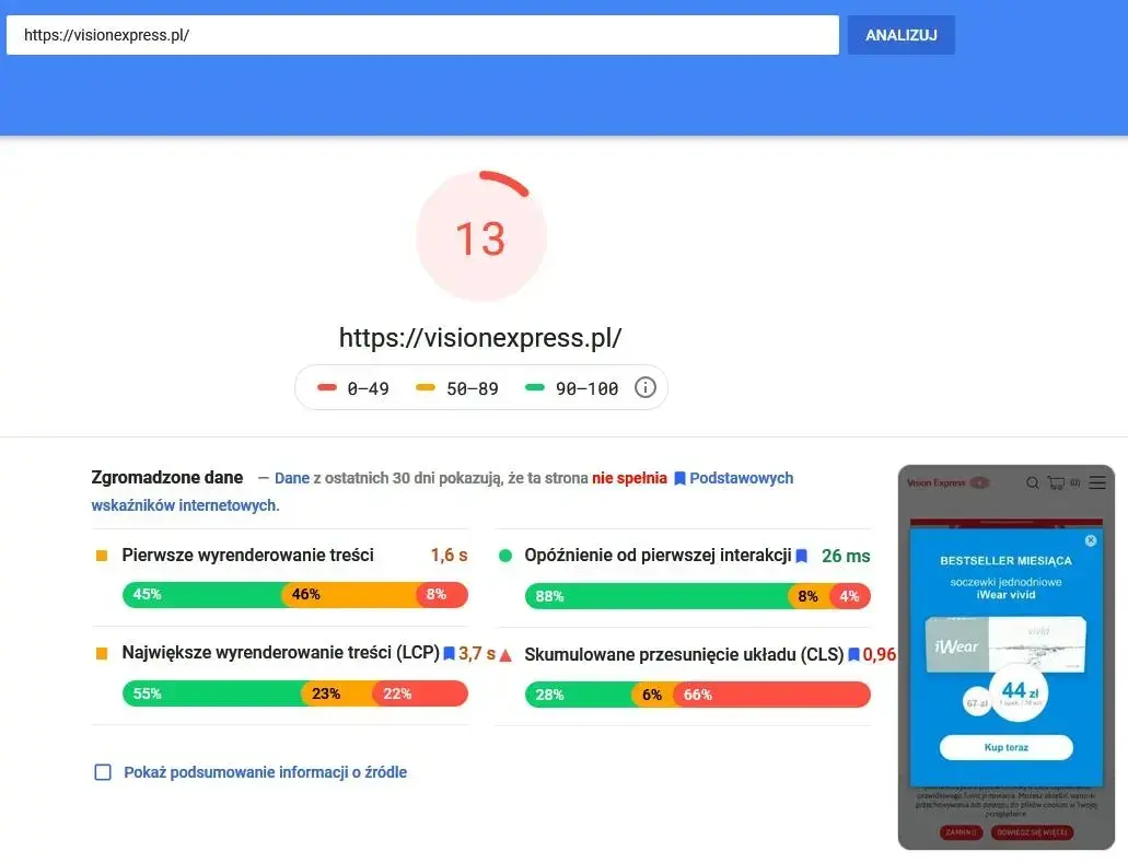 Print screen z systemu PageSpeed Insight z fragmentem analizy strony visionexpress.pl