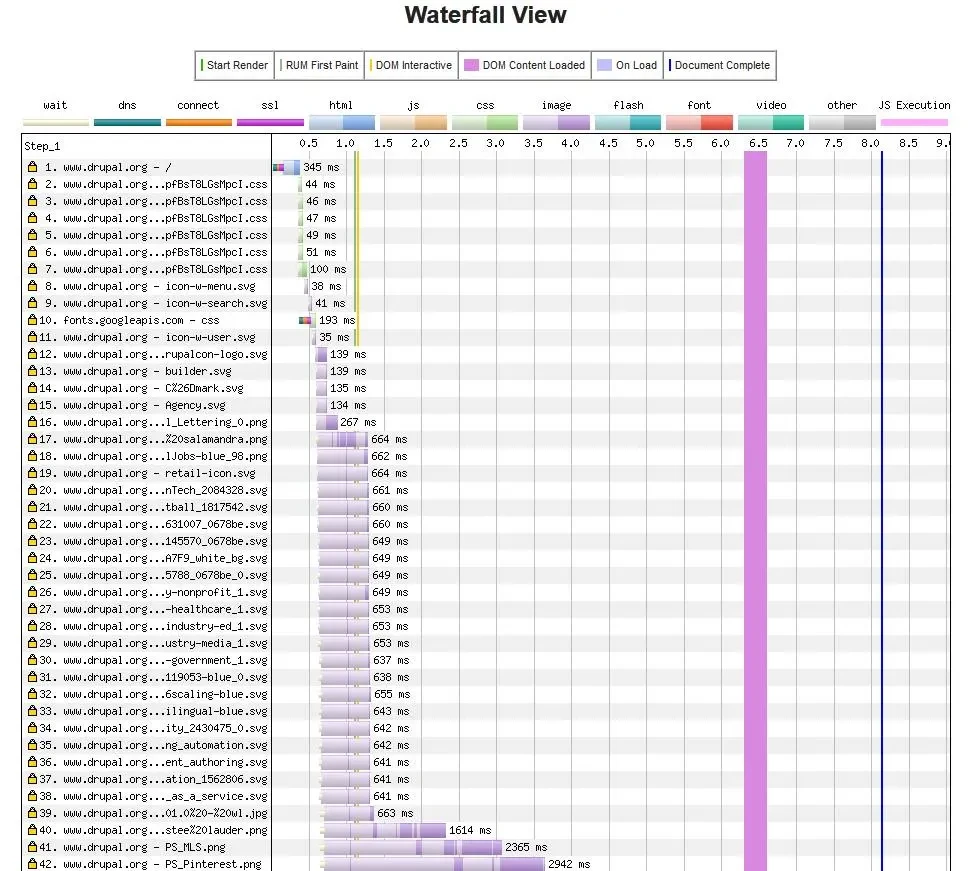 Fragment narzędzia WebPageTest dla witryny drupal.org