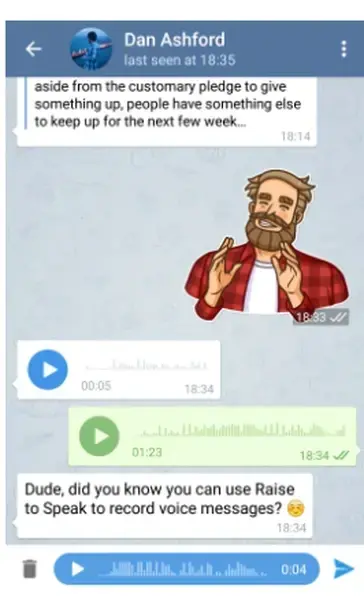 Nowe aktualizacje Telegrama sprawiły, że aplikacja zyskała wiele ciekawych funkcji. Jedną z nich była możliwość podniesienia telefonu do mówienia oraz podniesienia do słuchania. Dzięki czujnikom możliwa stała się bezdotykowa interakcja z rozmówcą. Telegram dał użytkownikom szansę na odsłuchiwanie długich wiadomości w tle, podczas korzystania z czatu lub z innych multimediów.