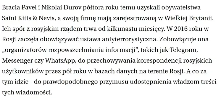 Fragment artykuły w wybrocza.pl. Źródło: https://wyborcza.pl/7,156282,23265437,rosja-blokuje-telegrama-bo-jego-tworcy-nie-spelnili-zadan.html