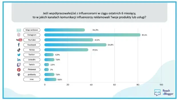 Działania z zakresu influencer marketingu widoczne są niemal na każdym kanale społecznościowym, jednak jak wynika z raportu „Rynek influencerów w Polsce - 2022”, opartego na badaniu, które przeprowadziła platforma ReachABlogger.pl, najczęściej wykorzystywaną platformą do promocji produktów jest Instagram. W Top 3 znalazły się także Facebook oraz YouTube.