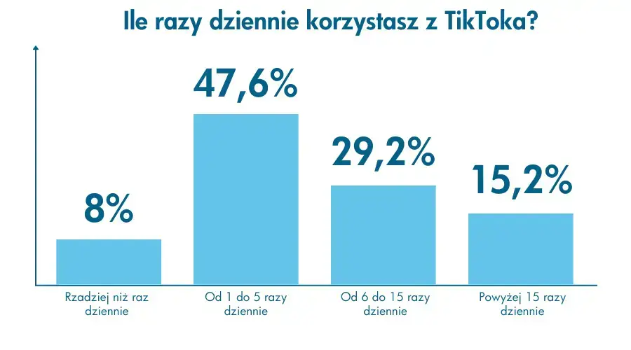 TikTok to stosunkowo młoda aplikacja, która w zaskakującym tempie zyskała ogromną popularność. Początkowo głównymi użytkownikami byli młodsi użytkownicy. Dziś obok nich, dominującą grupą są tzw. „młodzi dorośli”, czyli osoby między 18. a 35. rokiem życia. Bez względu na wiek - użytkownicy platformy spędzają na niej coraz to więcej czasu. Jak wykazał raport agencji GetHero, stworzony we współpracy z SWPS, użytkownicy TikToka korzystają z niego najczęściej od jednego do 5. razy dziennie.