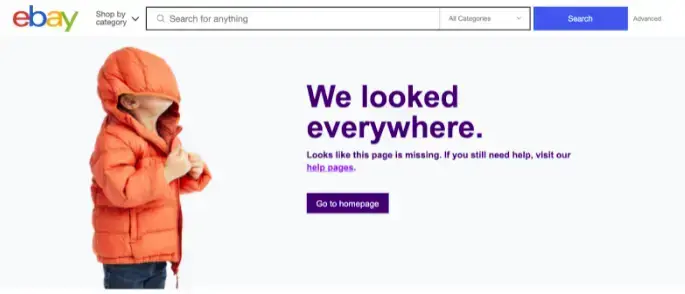 Przykład: Drugim przykładem jest komunikat o błędzie na stronie E-bay z komunikatem odnoszącym się do intencji klienta: "Szukaliśmy wszędzie" obok wizerunku dziecka z kurtką zakrywającą oczy i przyciskiem przekierowującym do strony głównej.