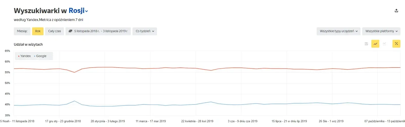 Oczywiście wyniki te różnią się w zależności od danego kraju. Wspomnieliśmy już o Baidu w Chinach, ale to nie jedyna popularna na tym terytorium wyszukiwarka. Dość znaczącą jest jeszcze Sogou (24%) i (w mniejszym stopniu) Shenma (ponad 7%) oraz Haosou, Bing i Google (po około 2,5%).
